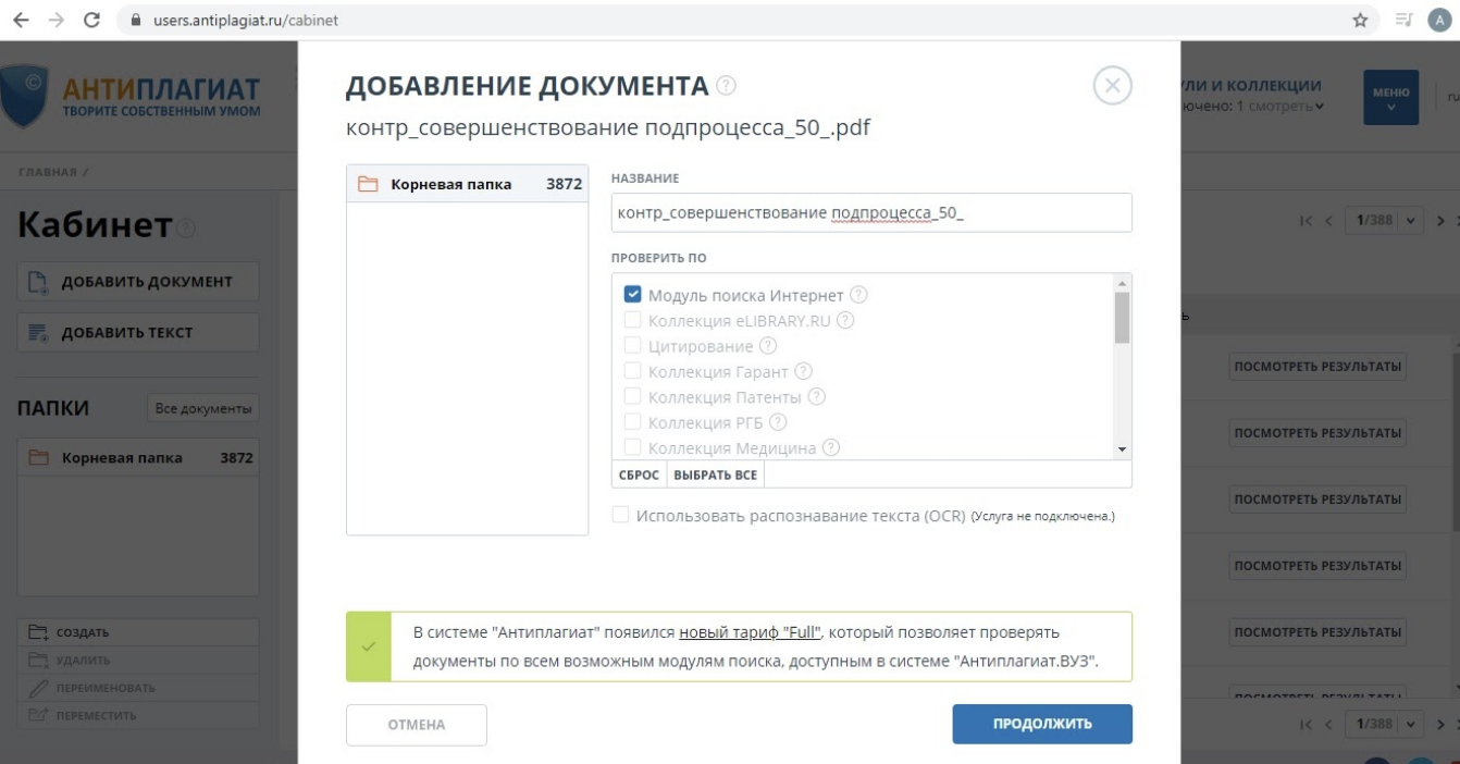 Самое главное отличие: в бесплатном доступе Antiplagiat.ru подключен всего 1 модуль - см. Рис.1. В системе Антиплагиат.ВУЗ есть возможность проверки по всем дополнительным модулям. - см. Рис.2. Например, одним из дополнительных модулей является “Кольцо ВУЗов”.